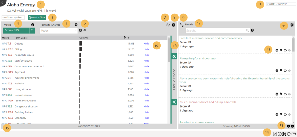 - Filters – Choose a key metric (e.g., sentiment, CSAT) to analyze alongside specific terms. Learn more: Filtering