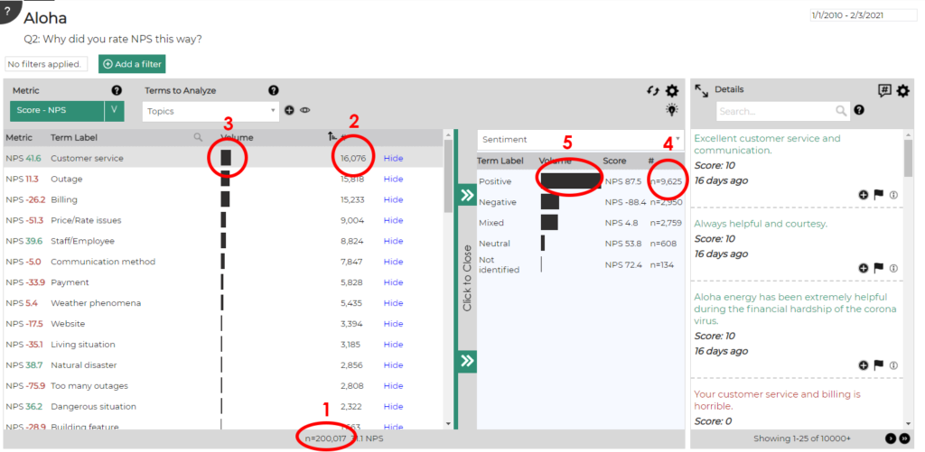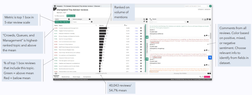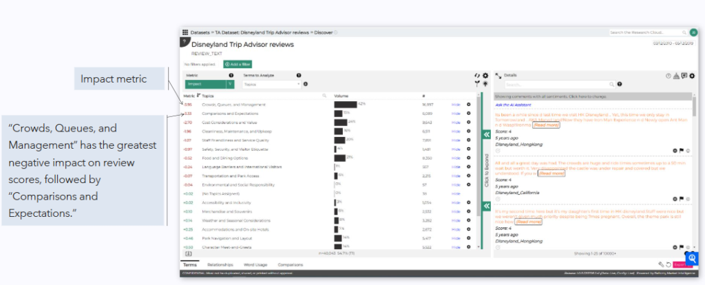 Now that AI-generated topics are loaded, we can analyze your data across a range of metrics from a standard list including customer ratings, impact, and sentiment – or those that you can configure to your specific needs.