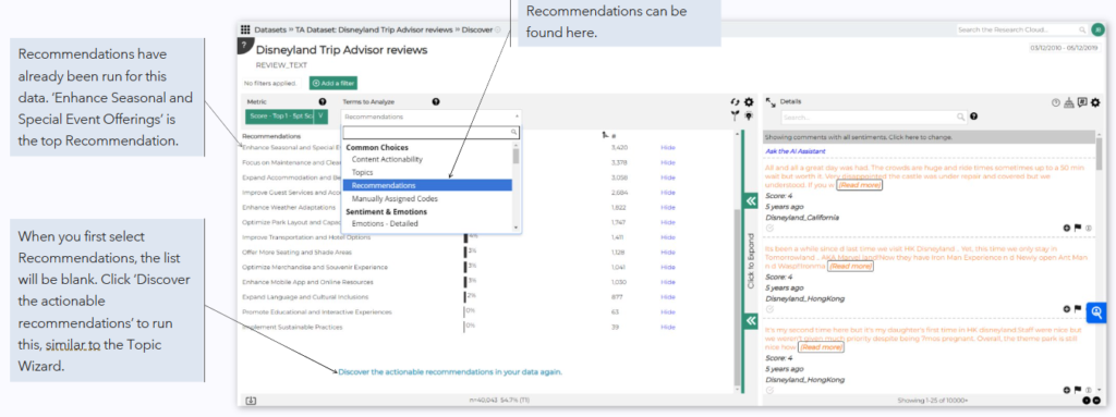 The Recommendations Engine can be found in the Terms to Analyze drop box right under Topics. Recommendations are AI-generated based on customer feedback in the dataset.