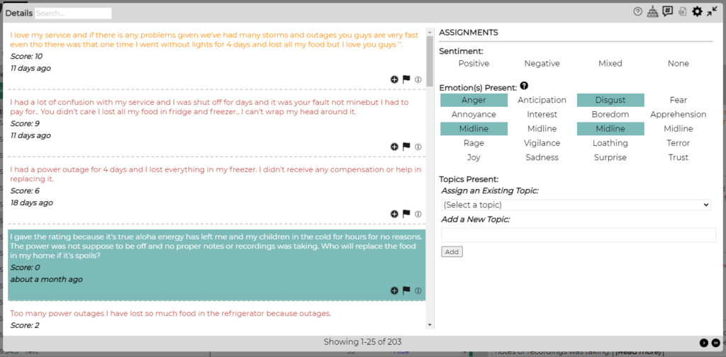 In the course of using the text analytics tool you may encounter comments that are not assigned sentiment, emotion or topics the way you think they should be. You can take action to correct those situations. You may also have a need to perform manual topic assignment.